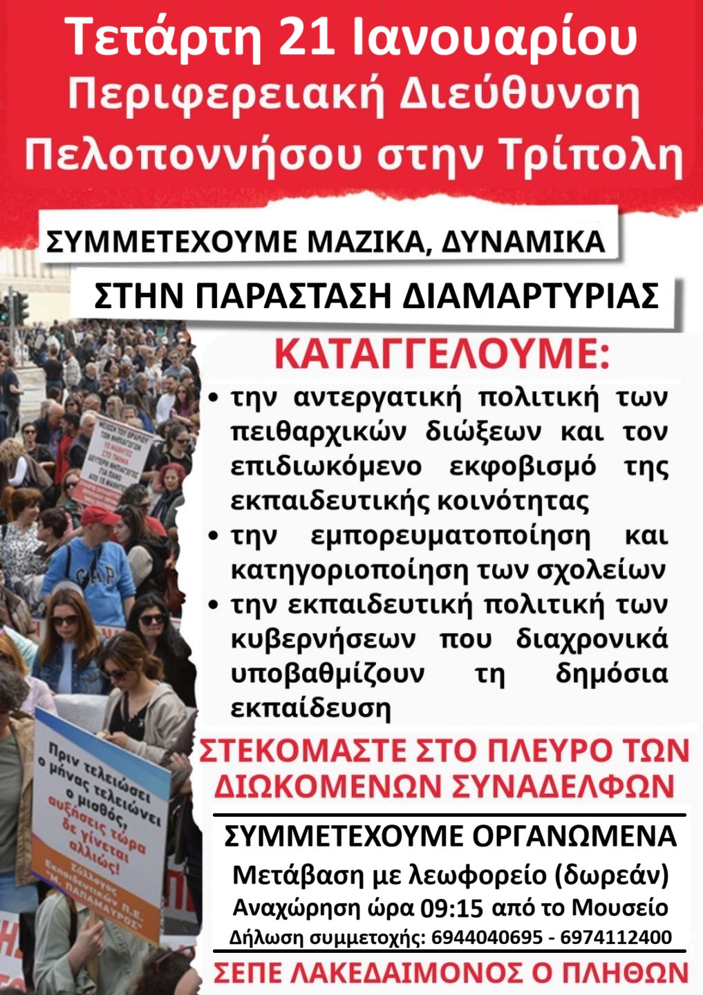 Την Τετάρτη 21 Ιανουαρίου 2026 και ώρα 11:00 ορίστηκε, μετά από νέα αναβολή η ακρόαση και απολογία των τριών συναδελφισσών εκπαιδευτικών Π.Ε., μελών του Συλλόγου μας ενώπιον του Α΄ Τμήματος του Πρωτοβάθμιου Πειθαρχικού Συμβουλίου της Περιφερειακής Διεύθυνσης Π.Ε. και Δ.Ε. Πελοποννήσου, στην Τρίπολη.