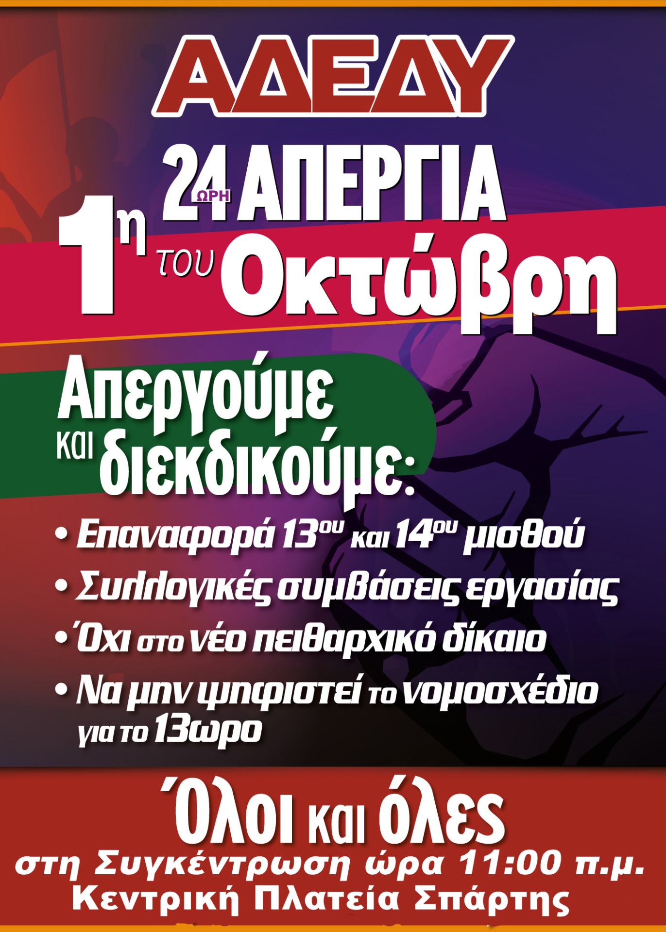 ΣΥΜΜΕΤΕΧΟΥΜΕ στην απεργιακή συγκέντρωση που οργανώνεται και στην Κεντρική Πλατεία της Σπάρτης, στις 11:00 π.μ., πίσω από το πανό των εκπαιδευτικών σωματείων.